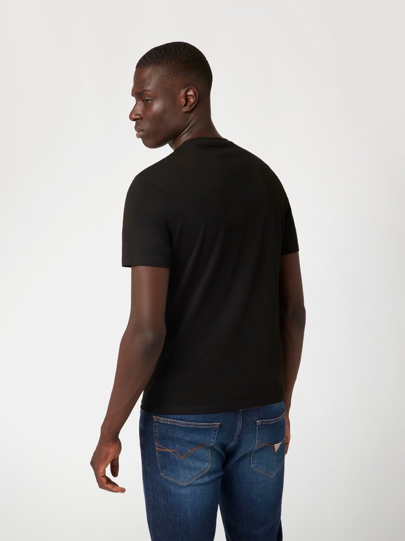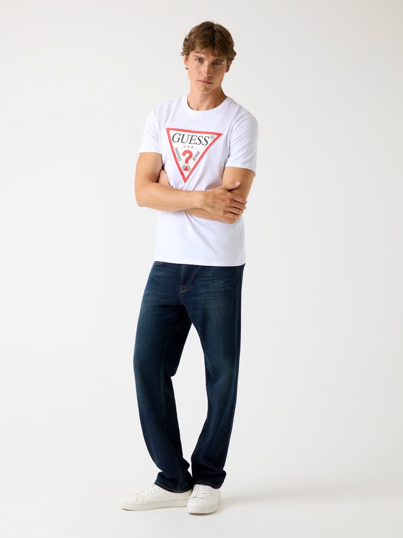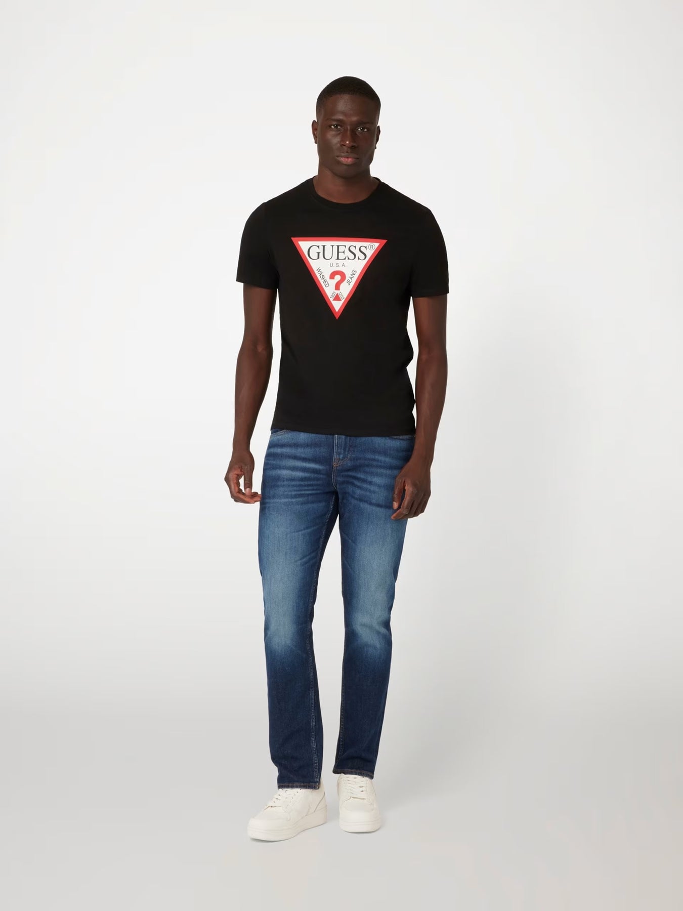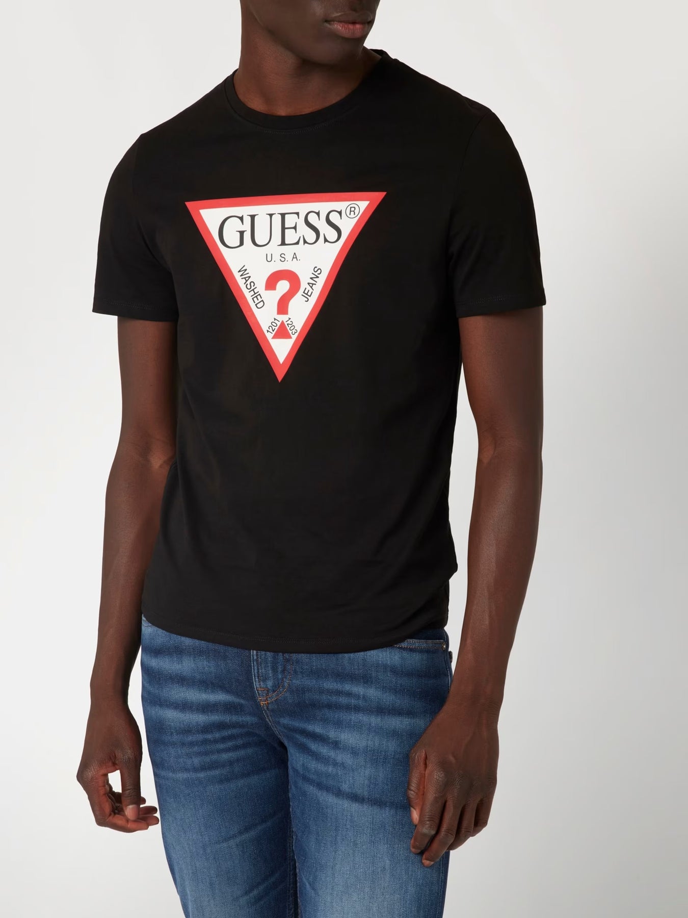 DETAIL KAIN: Logo segitiga di bagian depan.